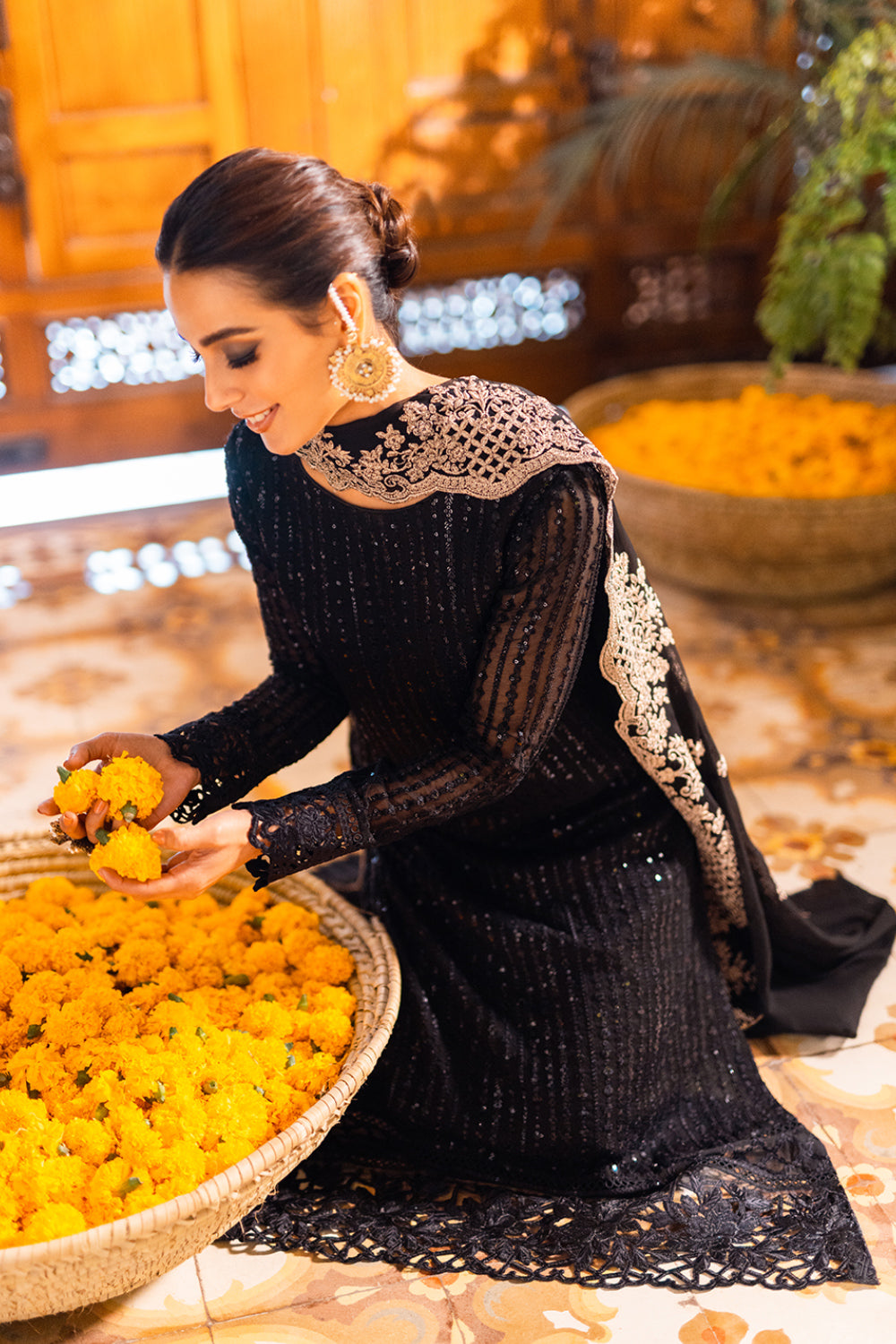 This deep black 'Onyx Dove' ensemble brings elegance and sophistication. Made from a fully sequin embroidered chiffon shirt is enhanced with a beautiful organza floral lace along its sleeve hems and borders. It is paired with a chiffon dupatta adorned with contrast scalloped embroidery and raw silk embroidered bottoms. Experience redefined luxury with this timeless look.