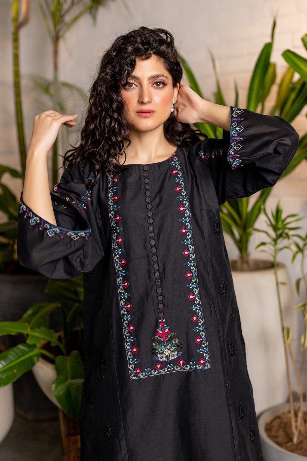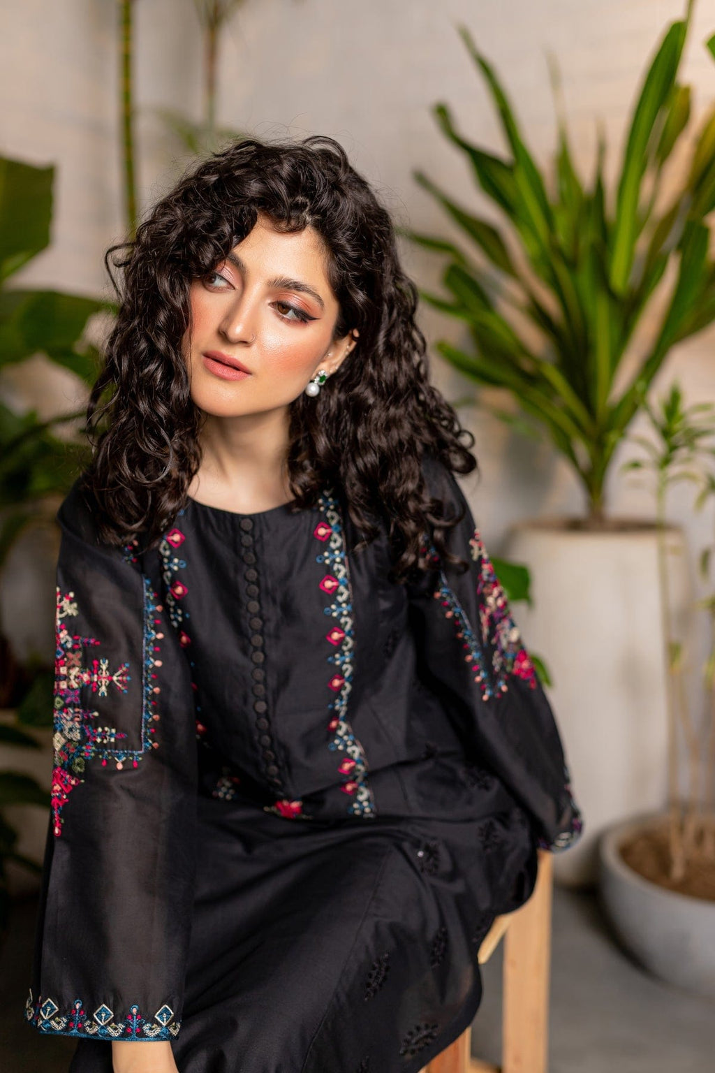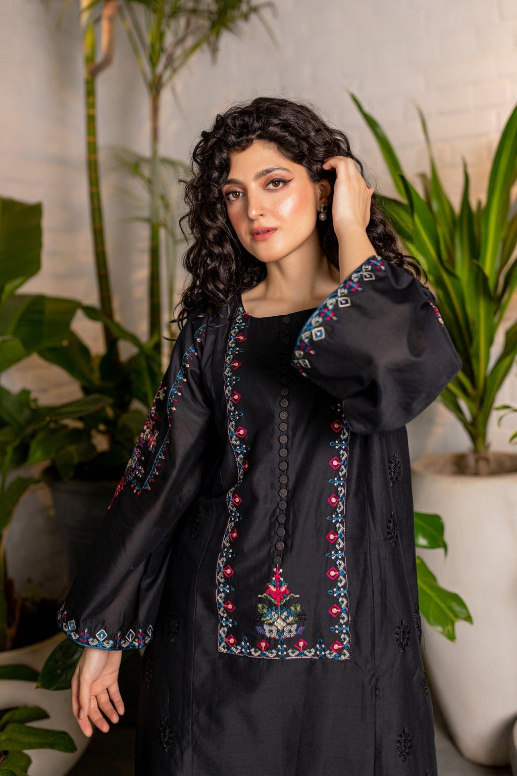 Beautifully designed straight paneled shirt cut from the finest quality Winter Cambric the shades of black. Embellishments feature embroidered neckline, side panels and sleeves with added details of buttons, loops and hints of sequin