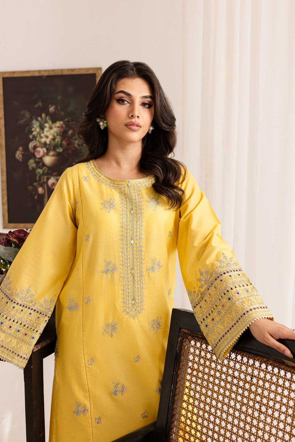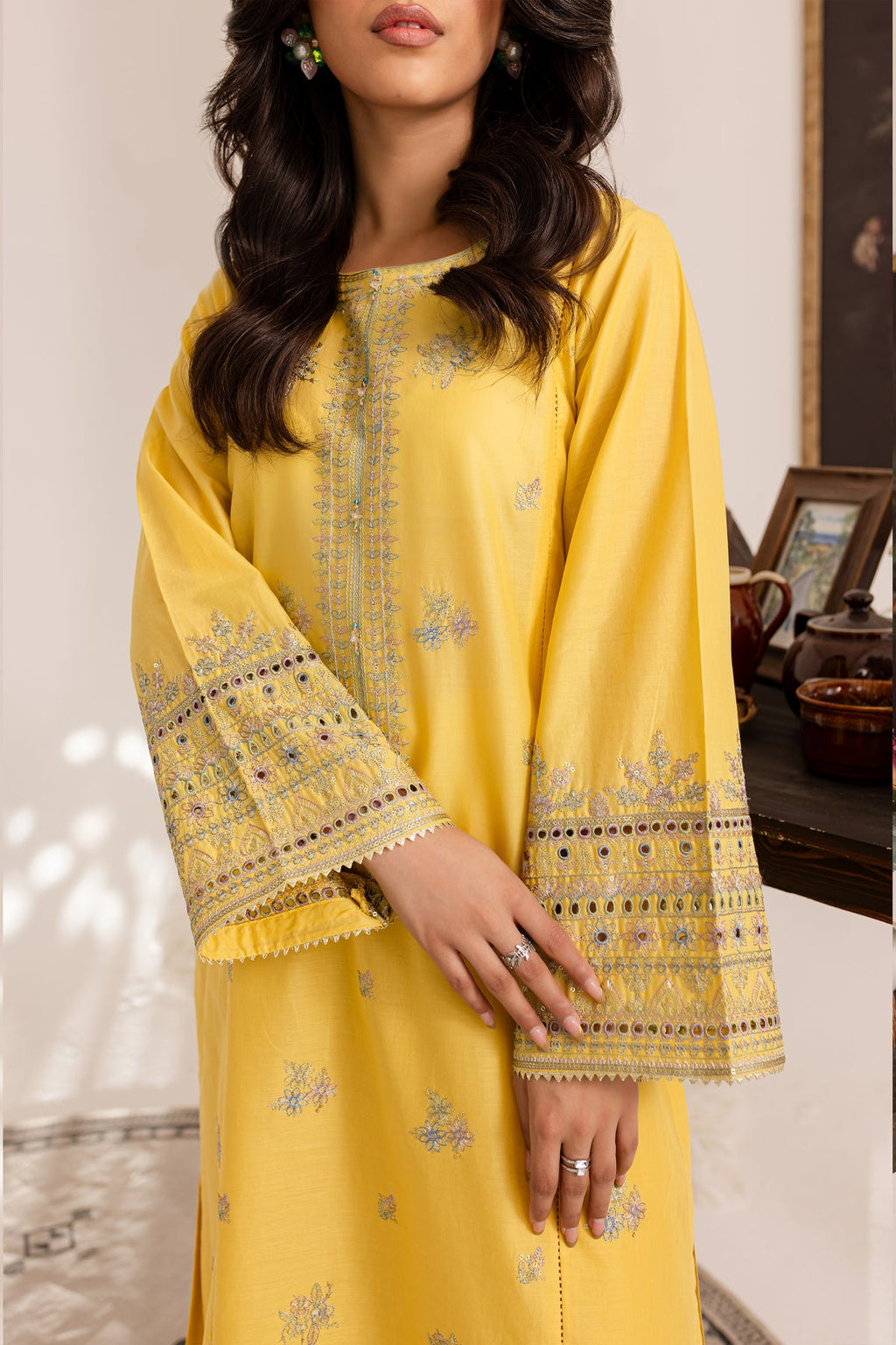 Flaunt this stunning outfit made from our premium quality Pima Lawn in the shades of yellow. Beautifully designed paneled shirt with embroidery spread all over further enhanced with a detailed embroidered neckline. Heavily embroidered sleeves with schiffli on sleeve hem add the extra oomph to this festive fit.
