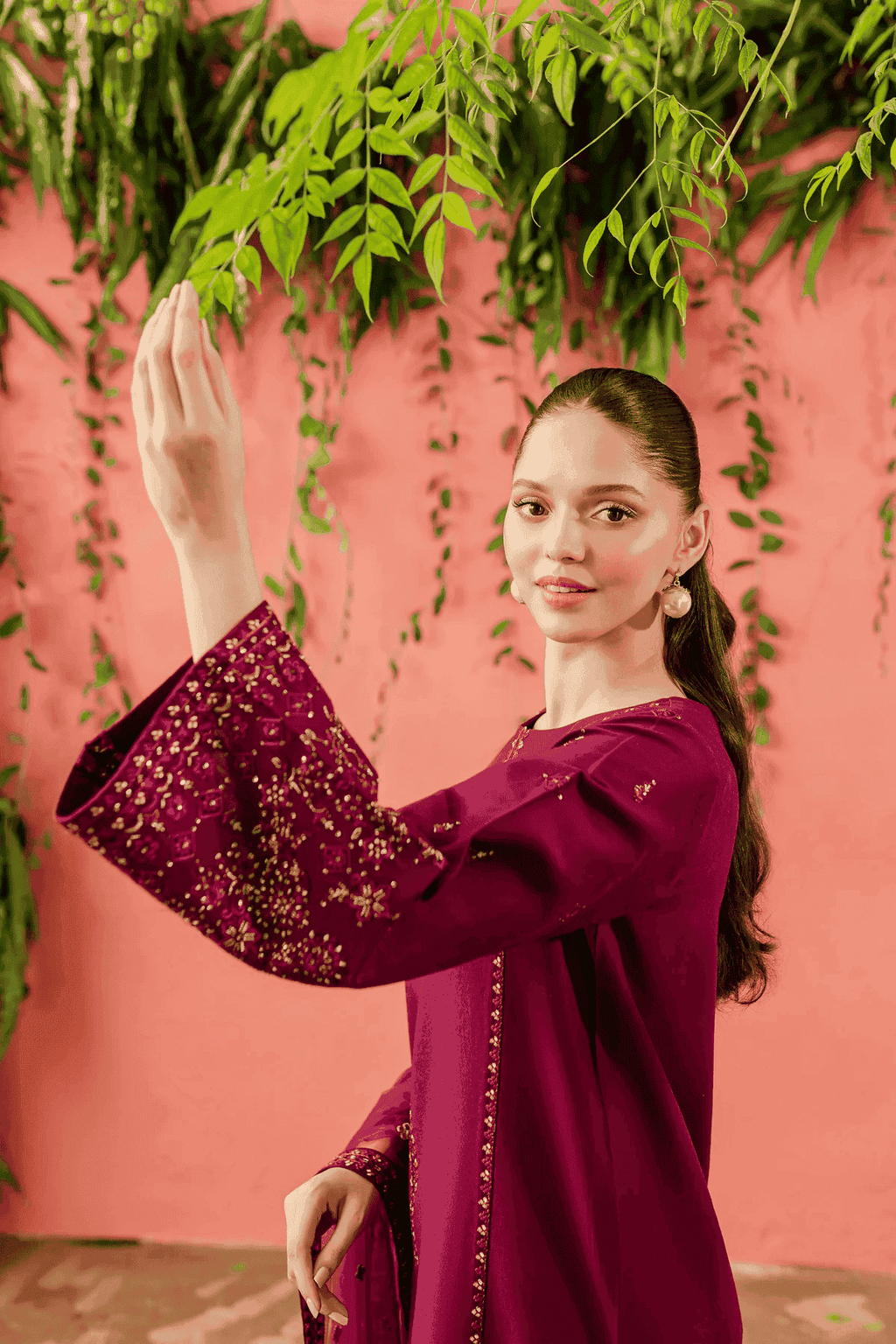 Make your look stand out with our premium quality soft Pima Lawn in the shades of burgundy. Uniquely designed paneled shirt displays intricate embroidery on the front with heavy embroidery on sleeves and hem.