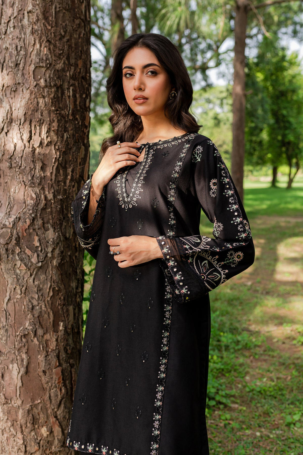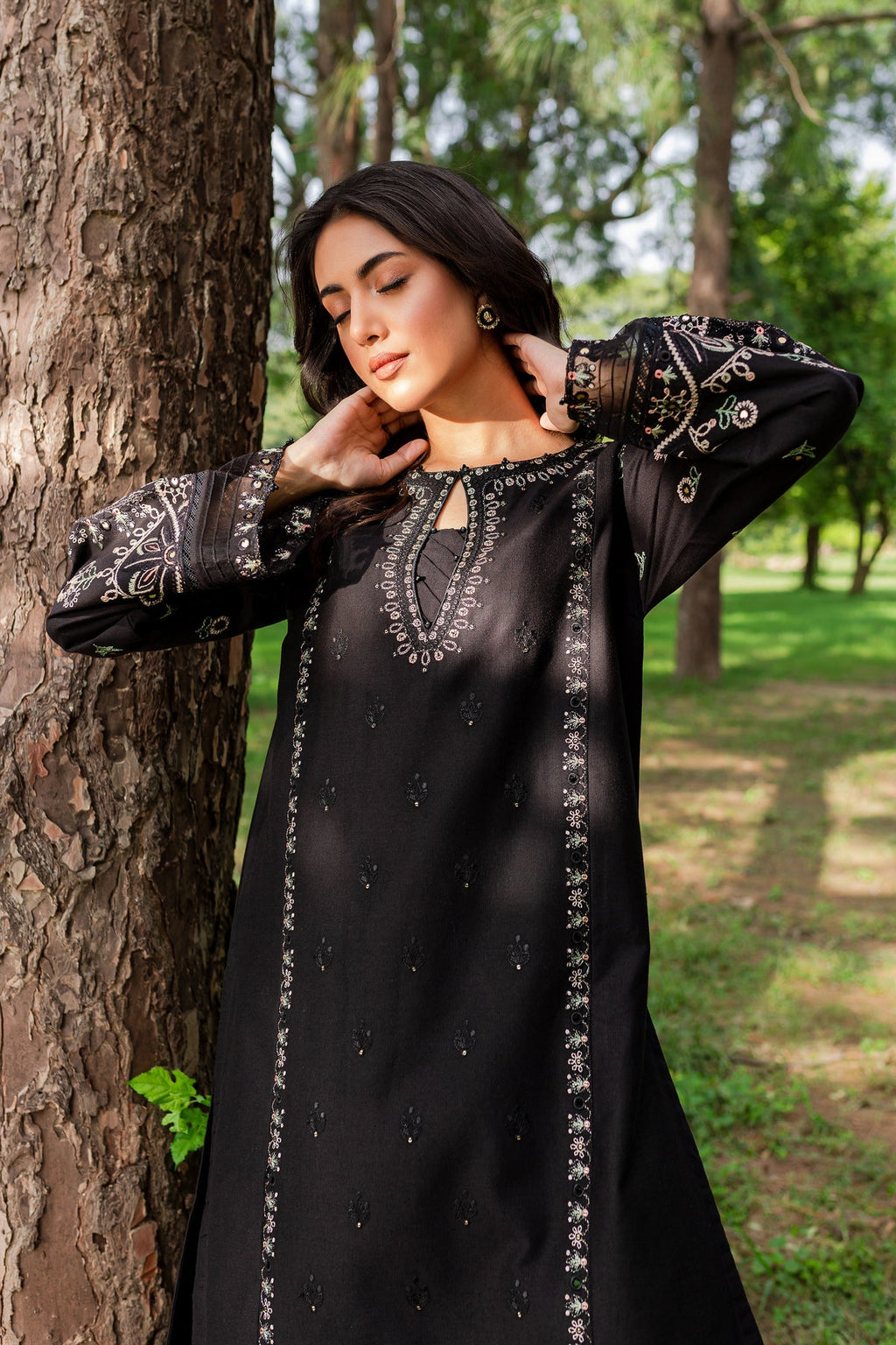 Flaunt this stunning solid set made from our premium quality Cotton in the shades of black. Elegantly crafted paneled shirt displays embroidery at front enhanced with beautiful technique and fine sequin details. Adornments further include detailed embroidery at sleeves.